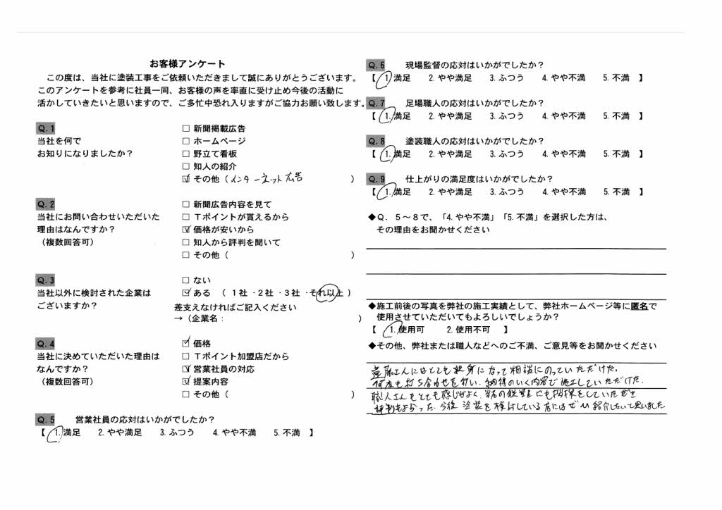令和7年6月施工・刈谷市 M 様 外壁塗装工事 BEFORE AFTER 施工エリア:刈谷市 お客様の声 VOICE 遠藤さんにはとても親身になって相談にのっていただけた。何度も打ち合わせを行い、納得のいく内容で施工していただけた。職人さんもとても感じ良く、当店の従業員にも挨拶をしていただき、評判も良かった。今後、塗装を検討している店には、是非 紹介したいと思います。 prev. 令和7年6月施工・豊川市 S 様 next. 令和7年7月施工・西尾市 U 様 この事例を読んだ方はこんな事例を読んでいます。 令和6年9月施工・刈谷市 M 様 施工エリア:刈谷市 カーポート工事コーキング工事外壁塗装工事 令和6年5月施工・刈谷市 T 様 施工エリア:刈谷市 外壁塗装工事 令和6年3月施工・刈谷市 H 様 施工エリア:刈谷市 外壁塗装工事 令和4年8月施工・刈谷市 T 様 施工エリア:刈谷市 外壁塗装工事