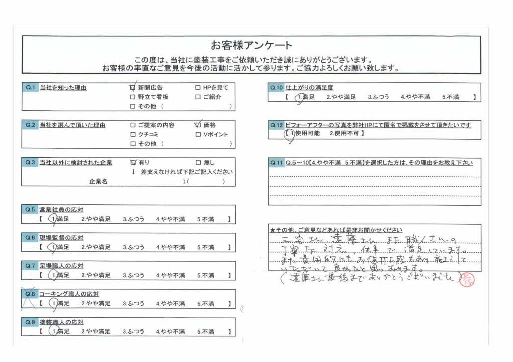 令和8年1月施工・安城市 I 様 外壁・屋根塗装工事 BEFORE AFTER 施工エリア:安城市 お客様の声 VOICE 三宅さん、遠藤さん、また職人さんの丁寧な対応、仕事で満足しています。また値段的にもお値打ち感もあり、施工して頂いて良かったと思います。(遠藤さん最後までありがとうございました。) prev. 令和7年12月施工・あま市 K 様 next. 令和8年1月施工・豊田市 M 様 この事例を読んだ方はこんな事例を読んでいます。 令和6年8月施工・安城市 H 様 施工エリア:安城市 コーキング工事外壁・屋根塗装工事 令和5年8月施工・安城市 S 様 施工エリア:安城市 コーキング工事外壁・屋根塗装工事波板工事 令和5年6月施工・安城市 K 様 施工エリア:安城市 コーキング工事外壁・屋根塗装工事破風鈑金巻き工事 令和4年12月施工・安城市 F 様 施工エリア:安城市 コーキング工事外壁・屋根塗装工事