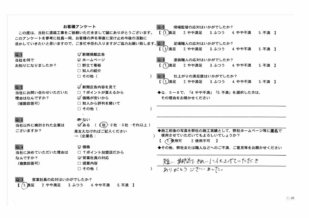 令和8年1月施工・中村区 H 様 外壁・屋根塗装工事 BEFORE AFTER 施工エリア:名古屋市 お客様の声 VOICE 短い期間できれいに仕上げていただき、ありがとうございました。 prev. 令和8年1月施工・豊田市 M 様 この事例を読んだ方はこんな事例を読んでいます。 令和7年5月施工・南区 S 様 施工エリア:名古屋市 外壁・屋根塗装工事屋上防水工事 令和7年3月施工・名東区 O 様 施工エリア:名古屋市 外壁・屋根塗装工事 令和7年1月施工・緑区 O 様 施工エリア:名古屋市 コーキング工事外壁・屋根塗装工事 令和7年1月施工・港区 M 様 施工エリア:名古屋市 外壁・屋根塗装工事