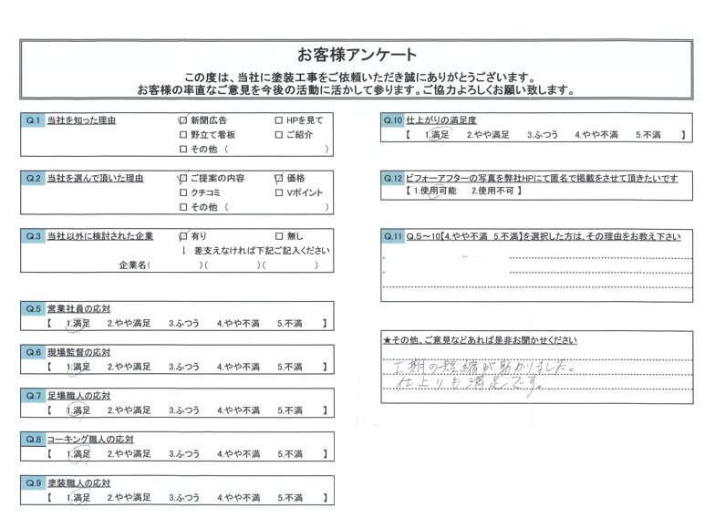 令和8年2月施工・北名古屋市 Y 様 外壁塗装屋根塗装コーキング工事 BEFORE AFTER 施工エリア:北名古屋市 物件面積:外壁179.4㎡ 工事期間:約2週間 使用材料 水性シリコン樹脂塗料 お客様の声 VOICE 工期の短縮が助かりました。仕上がりも満足です。 prev. 令和8年2月施工・西尾市 F 様 next. 令和8年2月施工・東浦町 T 様 この事例を読んだ方はこんな事例を読んでいます。 令和7年3月施工・北名古屋市 Y 様 施工エリア:北名古屋市 外壁塗装コーキング工事 令和5年4月施工・北名古屋市N 様 施工エリア:北名古屋市 コーキング工事鈑金工事その他外壁・屋根塗装工事